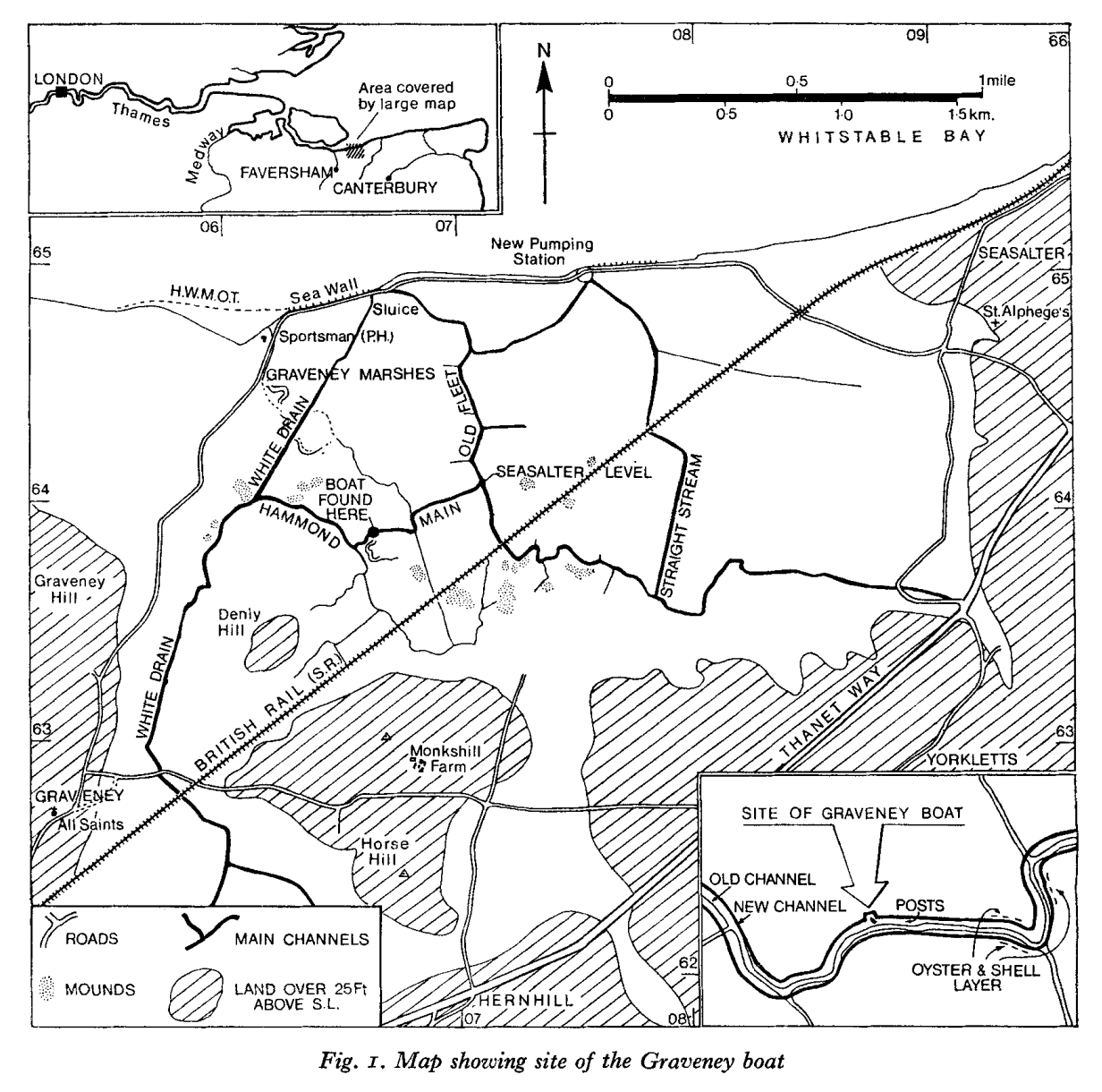 Charts depicting the location and plan of the Graveney boat, published by Cambridge University Press in the Antiquity journal